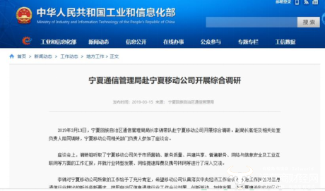 该文章称,“座谈会上,调研组听取了宁夏移动公司关于市场营销、服务质量、共建共享、普遍服务、网络与信息安全及工业互联网等方面的工作汇报,并就行业转型发展、网络提速降费及携号转网等进行了深入交流”。