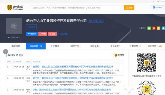 记者查阅启信宝发现,烟台完达山拖欠员工工资有了最新的进展,2019年3月15日烟台市牟平区人民法院陆续下达多个执行裁定书,共冻结烟台完达山公司存款人民币52.145811万元,期限十二个月,或查封相应价值物资,动产两年,不动产三年。