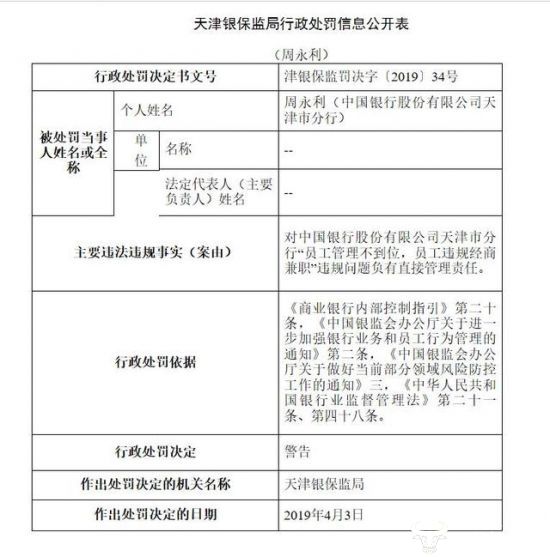 对此,天津银保监局对其作出罚款180万的行政处罚,并没收违法所得人民币0.56万元,罚没合计180.56万元。此外,由于周永利对中国银行天津分行“员工管理不到位,员工违规经营兼职”的违规问题负有直接管理责任,天津银保监局对其作出警告处罚。