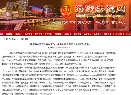 今日,海淀法院网发布消息称,北京搜狗信息服务有限公司、 北京搜狗科技发展有限公司因认为其享有著作权的搜狗高速浏览器在安装“蓝光宝盒”软件后主页被篡改为“hao123”主页,损害了其合法权益,以不正当竞争纠纷为由将“蓝光宝盒”软件著作权人北京蓝光引力网络股份有限公司、“hao123”主办单位北京百度网讯科技有限公司及“hao123”商标持有人百度在线网络技术(北京)有限公司诉至法院。