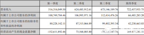 而与营业收入不同的是,净利润在四个季度中,第四季度的占比是最低的,仅为17.05%,约0.66亿;而占比最高的则是第三季度,约为1.12亿,占比约为28.94%。