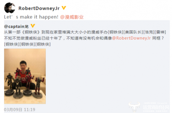 这些年来,随着漫威电影的火爆,漫威手办也引来广大粉丝的关注和收藏,很多明星也成了漫威手办的爱好者。不久前,奥运冠军马龙在微博晒出所有收藏的钢铁侠手办,并表示希望和唐尼合影,惊喜的是唐尼转发微博进行互动,领广大粉丝十分羡慕!