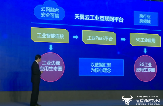何志强表示,中国电信依托云网融合的天翼云,打造了跨行业、跨领域的天翼云工业互联网平台,平台营造了工业边缘应用与5G工业应用APP两大生态圈。