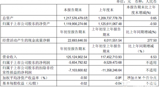 报告数据显示,本报告期末营业收入125,124,902.54 元,上年度末117452713.93 元,本报告期末比上年度末增加6.53%。同时,本报告期末其归属于上市公司股东的净利润为-5654792.82 元,上年度末为-9529473.68 元,此外,截止本报告期末基本每股收益-0.02 元/股,总资产达1217576479.07 元。