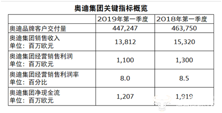 此外,今年第一季度奥迪集团销售收入为138.12亿欧元,相对于2018年同期的153.2亿欧元同比下滑9.84%。对此奥迪集团表示从2019年1月起,奥迪集团实施了财务报告结构调整,多品牌销售公司统一计入母公司大众集团的财务报告,在一定程度上影响了销售收入。