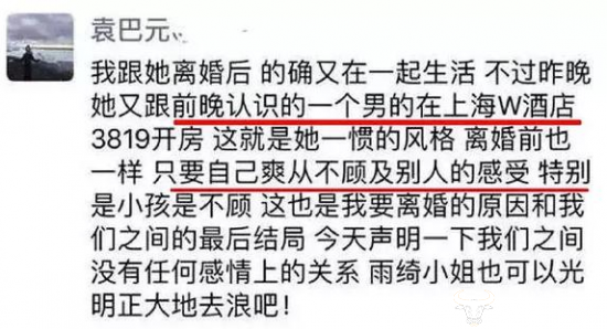 就在今年年初,张雨绮和前夫上演离婚、复合再闹掰的“狗血”大戏,袁巴元在朋友圈爆料称张雨绮和他离婚后在一起生活过,不过此后张雨绮跟认识两天的一个男的在上海某酒店开房,并直言这是她的一贯作风,只顾自己爽不管孩子。