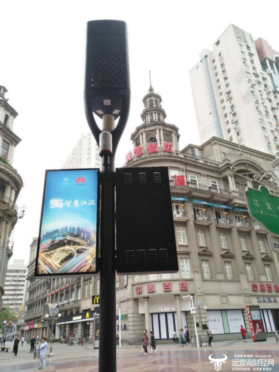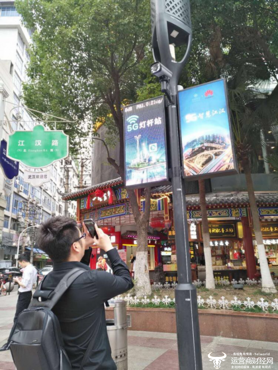 5月12日,湖北省武汉市江汉路步行街中心广场上竖起了一根5G智慧灯杆,杆顶端挂载着5G基站,上面还安装了摄像头、液晶显示屏和灯箱。这是湖北省乃至整个华中地区建成的首个5G智慧灯杆。