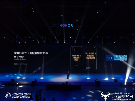 售价方面,荣耀20:8GB+128GB和8GB+256GB版价格分别为2699元和2999元,荣耀20 PRO :8GB+128GB和8GB+256GB版价格分别为3199元和3499元,荣耀20 PRO x MOSCHINO 联名版(8GB+256GB)价格为3799元。据了解,此次发布的荣耀20新品将于6月1日10:08全面开售,荣耀20PRO将于6月18日0点开售,线上销售平台为Vmall、京东、天猫、苏宁易购、唯品会、国美、荣耀亲选,荣耀20 PRO x MOSCHINO 联名版将于7月2日开启首销。
