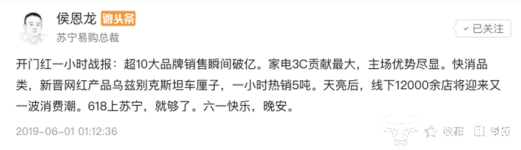 早在6月1日凌晨,苏宁易购总裁侯恩龙就在其微头条上公布了苏宁开门红一小时战报:“超10大品牌销售瞬间破亿。家电3C贡献最大,主场优势尽显。快消品类,新晋网红产品乌兹别克斯坦车厘子,一小时热销5吨。天亮后,线下12000余店将迎来又一波消费潮。”