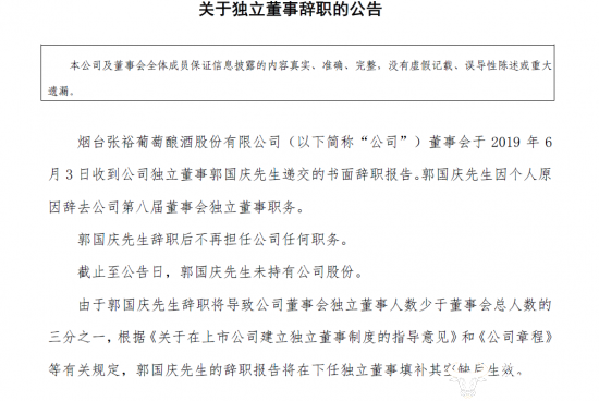 烟台张裕葡萄酿酒股份有限公司(以下简称“张裕”)发布公告称,董事会于6月3日收到公司独立董事郭国庆递交的书面辞职报告,郭国庆因个人原因辞去公司第八届董事会独立董事职务。