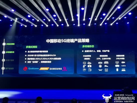 面向5G商用终端,中国移动将坚持“三多一新”的产品策略:多模式频段,推进终端多模多频发展,同步支持NSA/SA,推动2.6GHz与3.5GHz产业同步发展,稳步推进4.9GHz终端产业成熟;多终端形态,全面引导个人、家庭和行业各领域加快推出创新终端,为5G与各行业融通发展做好终端准备;多用户选择,推动5G芯片和终端价格快速下探,面向消费和行业市场,分别打造超百款终端产品;新产业生态,孵化5G应用,构建5G个人新生态及行业新生态。