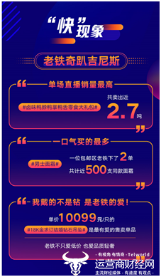 今年京东“618”品质消费升级趋势明显,同样体现在跟快手的合作中。数据显示,单场直播销量最高的产品是卤味鸭脖鸭掌鸭舌零食大礼包,共卖出2.7吨,这说明高端零食消费正成为消费者的休闲选择。而看中京东品质,针对男性用户的产品更是得到追捧,一位包邮区的老铁下了两单,买了共计近500支男士护肤品。另外,虽然快手平台62.5%的用户正处于25岁及以下的年龄段,但是他们对于品质生活的追求毫不放松,单价高达10099元一只的18K金求订婚钻石吊坠也被快手老铁收入囊中,成为这次最有爱的售卖单品。