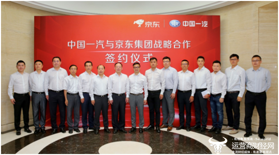 2019年6月28日,京东集团与中国第一汽车集团有限公司(下简称“一汽”)在北京京东总部签署战略合作协议。一汽集团公司党委常委、副总经理邱现东,京东集团高级副总裁、战略合作部负责人胡胜利出席签约仪式,一汽集团公司总经理助理兼战略管理部部长胡咏与京东零售集团企业业务大型客户部总经理李靖代表双方签约。协议约定,双方将围绕智能采购服务、智慧物流、市场营销、移动出行、智能物联网、公益事业、金融服务、后市场等一系列领域开展广泛业务合作,共同探索汽车行业“从产到销”的全链条数字化经营模式。