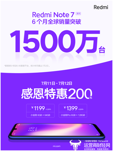2019年7月10日,小米集团副总裁、Redmi品牌总经理卢伟冰正式对外宣布Redmi Note 7系列手机全球销量突破1500万台。今年1月10日,Redmi品牌独立当日即发布首款产品Redmi Note 7,随后在3月18日发布了第二款产品Note 7 Pro。Redmi Note7系列产品发布后,发售29天中国区销量破100万台,45天销量从100万台到400万台,用时129天全球销量突破1000万台。截至7月2日,六个月时间Redmi Note 7系列全球销量突破1500万台。同时,小米官方宣布,感恩特惠7月11-12日,Redmi Note 7限时闪降活动,Redmi Note 7的6GB+64GB版本1199元,Redmi Note7 Pro的6GB+128GB版本1399元。