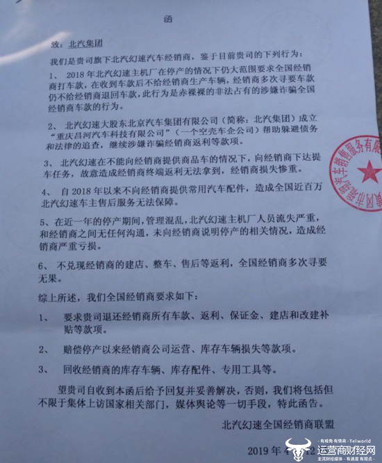据了解,彼时,北气银翔全国经销商联盟向北汽集团提交了一封《函》,上面列明了维权事宜及经销商们的相关诉求,而在警方的介入下,北汽集团运营总监、北汽银翔董事长兼法人代表李凌日与5位经销商代表进行了沟通协商,但最终不欢而散。