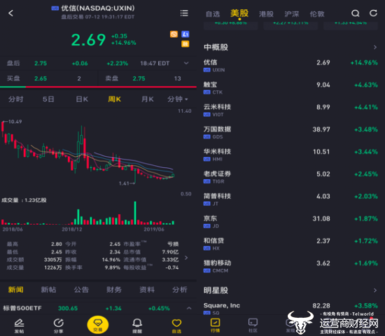 北京时间7月12日,国内最大二手车电商交易平台优信(NASDAQ:UXIN)宣布,将对公司二手车交易衍生的助贷业务与Golden Pacer(58金融)进行合并升级。受此重大利好消息影响,当晚美股开盘后,优信股价即一路上涨,盘中最高涨幅一度达到19.66%。截至当日美股收盘,优信股价最终收报2.69美元,以14.96%的涨幅领跑中概股。
