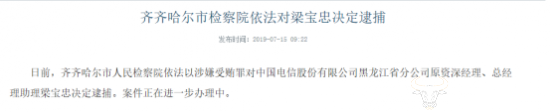 今年3月,中国电信股份有限公司黑龙江分公司原资深经理、总经理助理梁宝忠因经济问题被查,直到日前,齐齐哈尔市人民检察院以涉嫌受贿罪对其进行逮捕,但具体违法原因和贪污数额还未公布。