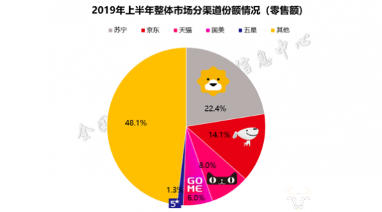 7月30日下午,“2019年中国家电行业半年度报告发布会”在北京召开。会上,中国家用电器研究院和全国家用电器工业信息中心联合发布《2019年中国家电行业半年度报告》,报告指出,2019年上半年,中国家电市场零售额规模为4125亿元。其中,苏宁占比22.4%,持续领跑全渠道第一。京东由于在线下市场的短板,份额占比为14.1%,位列第二位,与苏宁相差8.3%。