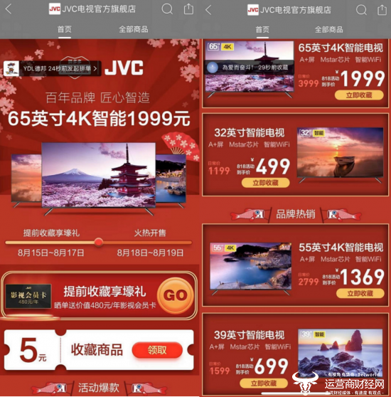 ▲“新品牌计划”联合JVC研发的首批定制化大屏电视,将于8月18日零时正式登陆拼多多“限时秒杀”、“大牌驾到”等专区。其中65英寸4K智能大屏电视,售价仅1999元