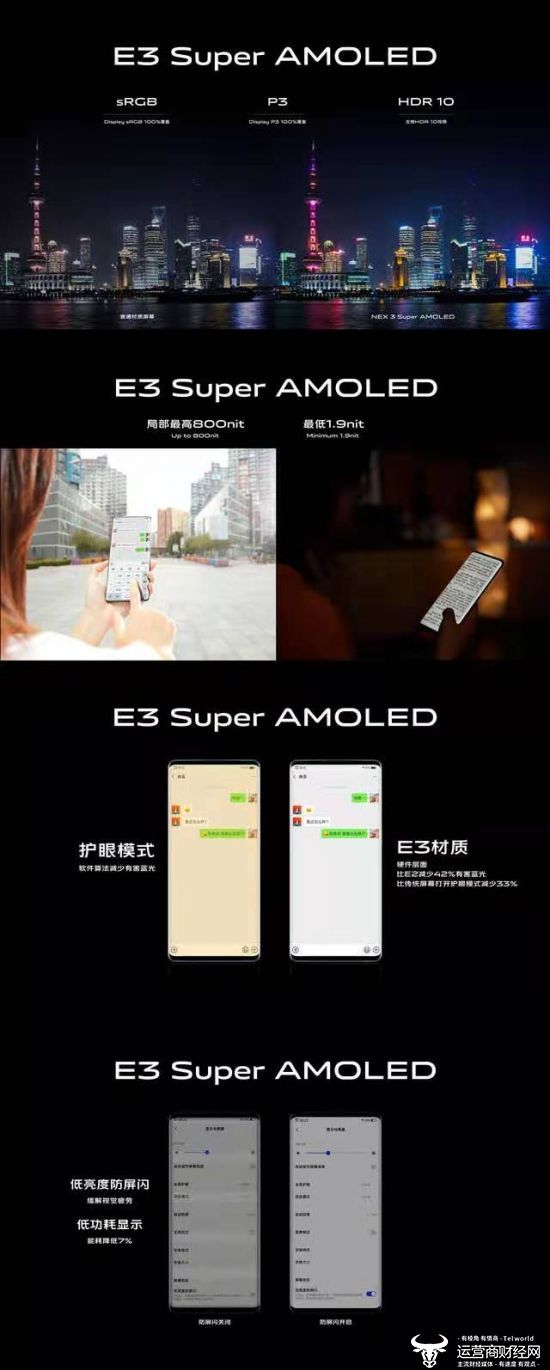 vivo NEX 3无界瀑布屏还采用E3 Super AMOLED材料,不但支持100% P3广色域、sRGB和HDR 10标准,显示亮度最高亦可支持到局部800nit,最低支持到1.9nit,具备更佳的色彩还原度,对比度和显示效果。NEX 配备的护眼屏,有效减少有害蓝光,成功通过德国莱茵护眼认证。