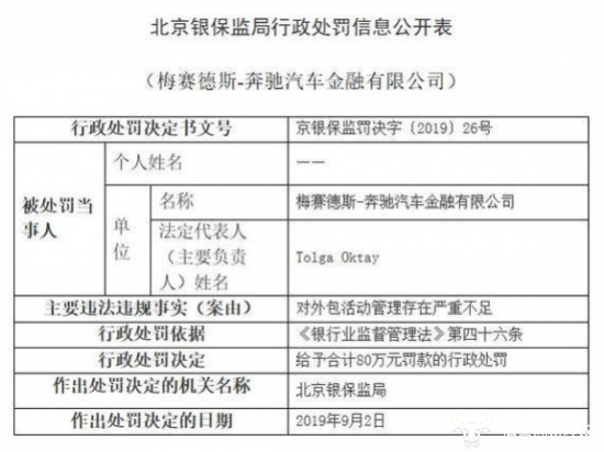 近日,中国银行保险监督管理委员会官网公告称,因“对外包活动管理存在严重不足”,梅赛德斯-奔驰汽车金融有限公司(简称“奔驰金融公司”)被北京银保监局处以80万元的行政处罚。而这一处罚,或有望整治4S店乱收“金融服务费”的现象。