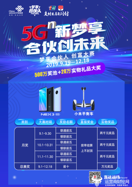 “5Gⁿ新梦享 合伙创未来”,这是江西联通为梦享合伙人创富计划上线一周年的特别企划,大赛从9月19日持续到12月18日,设置500万奖池和20万智能家居实物奖品,月月有大奖,最后再决出总赛前十名,每人奖励一台苹果笔记本和一部vivo5G手机。用户关注江西联通微信公众号,进入合伙赚钱菜单,点击创富大赛专题即可参与。