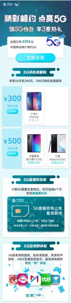 随着5G正式商用的临近,各大手机厂商已经瞅准消费者的换机需求推出了多款5G手机,价格从三千多到六千多不等。此前上海移动已经举办了多款5G手机的首销活动,为了进一步推动5G普及,让更多用户轻松换机,上海移动通过终端价差让利,为客户提供5G手机购机直降服务,包含300元、500元两档额度,客户预约领取优惠额度后,购买5G手机时就可以抵充了。