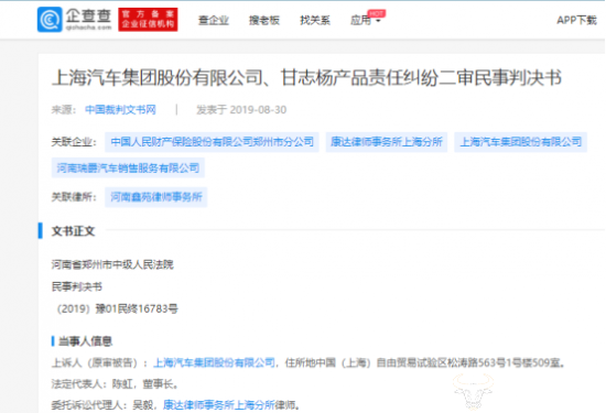 不过,8月27日,二审判决书下达,驳回上汽集团请求,上汽集团还要承担3000多元的审理费。