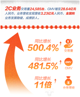 自全国购业务第一单起,优信开创的全国购已经3年,从第一年的摸索式发展到三年后的Q2财报,越来越显示出优信2C业务的长期可持续战略。据财报显示,在业务方面,优信2C全国购业务继续保持倍数级的增长态势,已经成为其业务核心和增长引擎。数据显示,2019年第二季度,优信2C业务实现营收为3.23亿元,同比增长11倍;2C业务交易量增加至24585台,同比增长500.4%;同样2C交易总额(GMV)也增加至28.64亿元,同比增长481.5%。