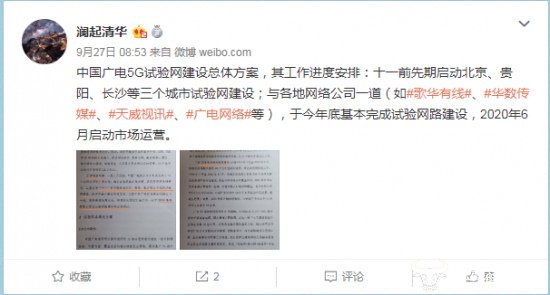 一个微博曝光了相关文件,该文件名为《中国广电5G试验网的建设实施方案》。