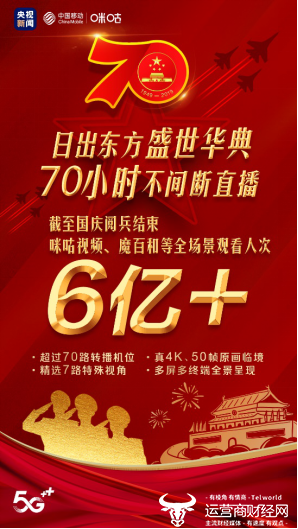 北京时间10月1日,新中国成立70周年阅兵盛典圆满落下帷幕。自9月29日早上6点开启国庆直播特别节目以来,截至阅兵结束,中国移动旗下咪咕视频、魔百和等全场景观看人次超过6亿。这是5G商用以来首次阅兵盛典,中国移动携手央视新闻、人民网、新华网三大央媒,打造史上首次4K超高清多视角直播,为用户带来了70小时不间断、50帧原画、独家7路特殊视角的多终端跨屏体验。