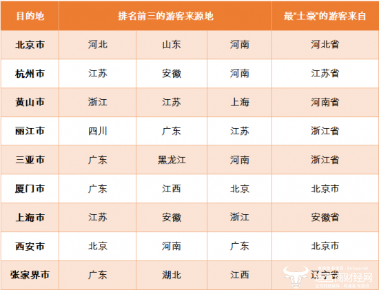 表:以下旅游城市中,来自哪里的外地游客最多