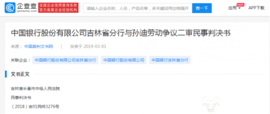 据企查查显示,中国银行股份有限公司吉林省分行与孙迪劳动争议二审民事判决书如下: