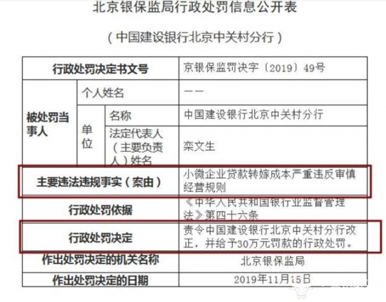 同时,建设银行北京中关村分行因小微企业贷款转嫁成本严重违反审慎经营规则,被责令改正,并给予30万元罚款的行政处罚。
