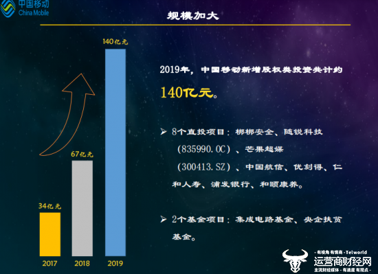 这也是为何在基础电信服务领域增长压力凸显的情况下,中国移动投资公司的跨界投资力度进一步增强的原因。