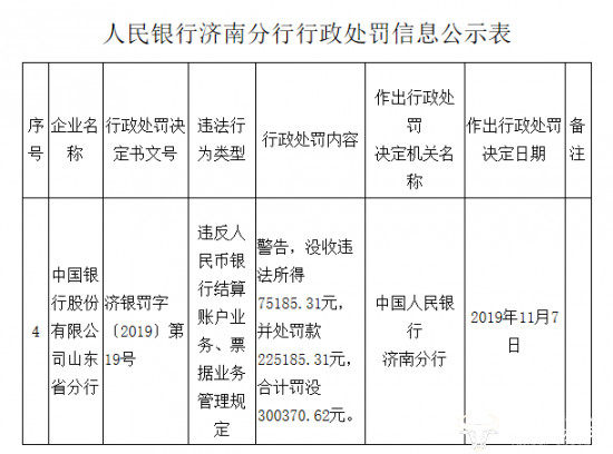 近日,中国银行山东省分行存在违反人民币银行结算账户业务、票据业务管理规定的违法行为,中国人民银行济南分行对其处以警告,没收违法所得7.52万元,并处罚款22.52万元,合计罚没30.04万元。