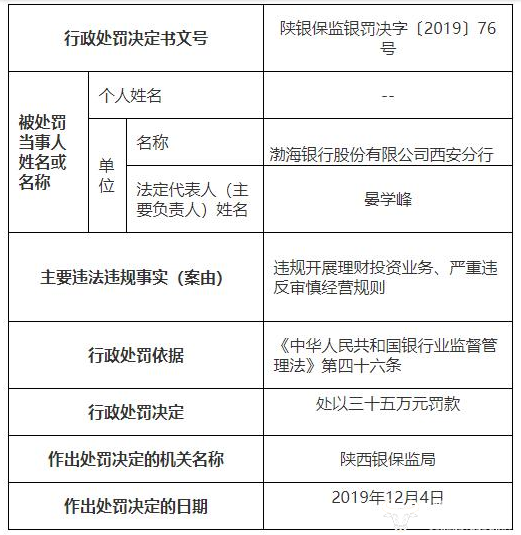 近日,陕西银保监局对渤海银行股份有限公司西安分行开出两张处罚决定书,主要违法违规事实(案由)为:贷款资金违规挪用、严重违反审慎经营规则;违规开展理财投资业务、严重违反审慎经营规则,分别罚款25万元和35万元。
