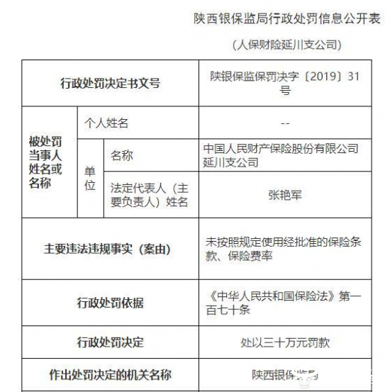 近日,中国人民财产保险股份有限公司延川支公司存在未按照规定使用经批准的保险条款、保险费率的违法违规行为。根据《中华人民共和国保险法》第一百七十条,陕西银保监局对其处以30万元罚款。并且其代表人张艳军负有管理责任,被罚五万元。