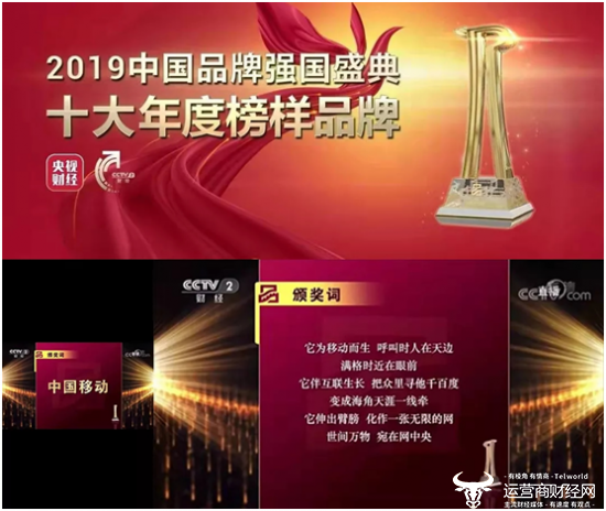 12月15日,在中央广播电视总台品牌强国盛典活动中,中国移动斩获“2019十大年度榜样品牌”。