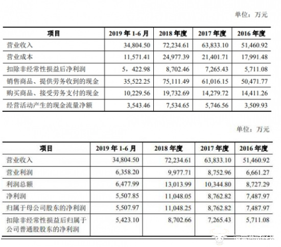 三力制药近年营收、净利逐年增长,但同期经营净现金流始终低于同期净利润。2016年-2018年及2019年1-6月,三力制药营业收入分别为5.15亿元、6.38亿元、7.22亿元、3.48亿元。销售商品、提供劳务收到的现金分别为5.05亿元、6.10亿元、7.51亿元、3.55亿元。