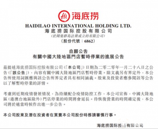 运营商财经网获悉,早在1月26日,海底捞就已经暂停了内地的门店经营,预计亏损高达50亿。而这自然影响今年一季度的财报,从而导致海底捞的股价下降,另外对于全年的扩店计划也会有冲击。