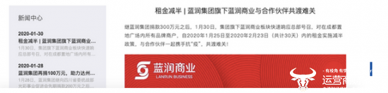 近期,为给疫情防控工作持续贡献企业力量,以便尽早赢得这场疫情攻坚战,蓝润集团目前已累计捐款300万元,且其集团旗下商业也已积极实施减租政策,与合作伙伴一起携手抗疫。