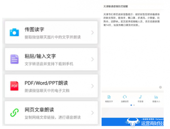 联通在线沃音乐太极AI平台打造的AI语音服务功能,由科大讯飞提供技术支持,具备OCR文字识别技术与TTS语音合成技术,可支持多种文字导入识别形式,提供多种朗读风格及朗读语种,可进行点播、分享、保存、下载等操作。用户可在微信中搜索讯飞快读小程序,输入疫情防护宣传相关文字,转为AI语音合成音频、生成视频和MP3下载,不到3分钟即可得到专业播音员音质的音频文件,简便快速,更好的让疫情防控知识入耳、入心。目前该产品已在天津联通、吉林联通等机构进行推广试用。