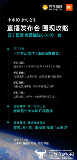 2月13日14时,小米10旗舰新品将在苏宁直播以“云发布会”形式在线发布,届时雷军将出席发布会,为大家带来包括小米10在内的多款新品。