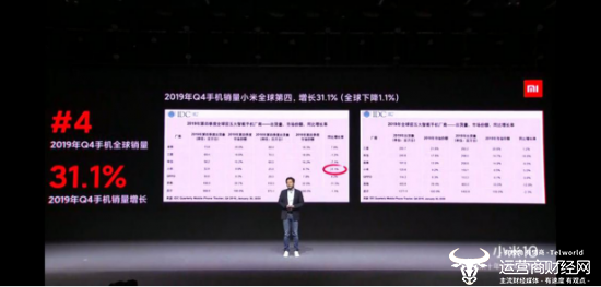 雷军称,2019年Q4手机销量占据全球第四,在全球手机销量下降1.1%的情况下 ,小米手机增长31.1%。