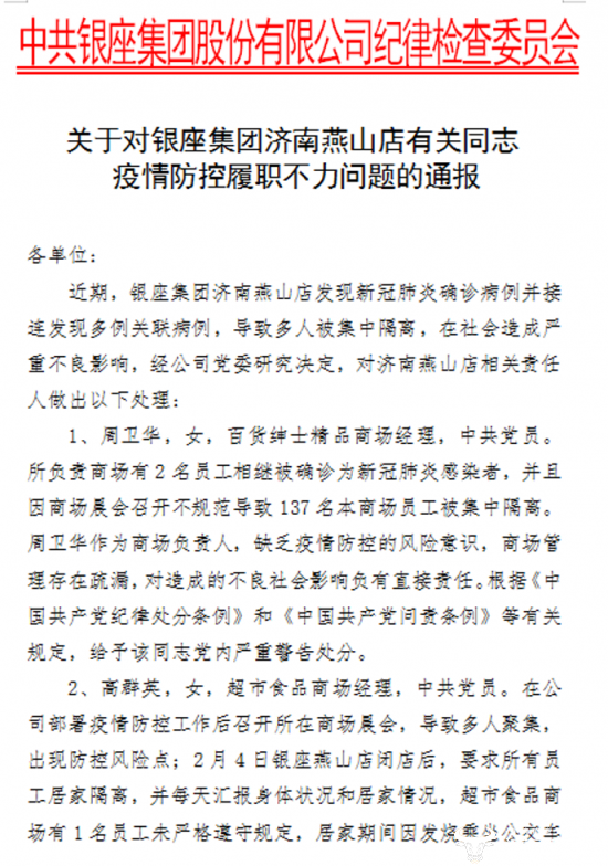 一份由“中共银座集团股份有限公司纪律检查委员会”发布的,关于《对银座集团济南燕山店有关同志疫情防控履职不力问题的通报》。该通报称,近期,银座集团济南燕山店发现新冠肺炎确诊病例并接连发现多例关联病例,导致多人被集中隔离,在社会造成严重不良影响,经公司党委研究决定,对济南燕山店相关责任人作出处理。此番处理,共涉及5名责任人,这5名责任人分别别处以党内严重警告处分或党内警告处分。这处罚够轻的呀。