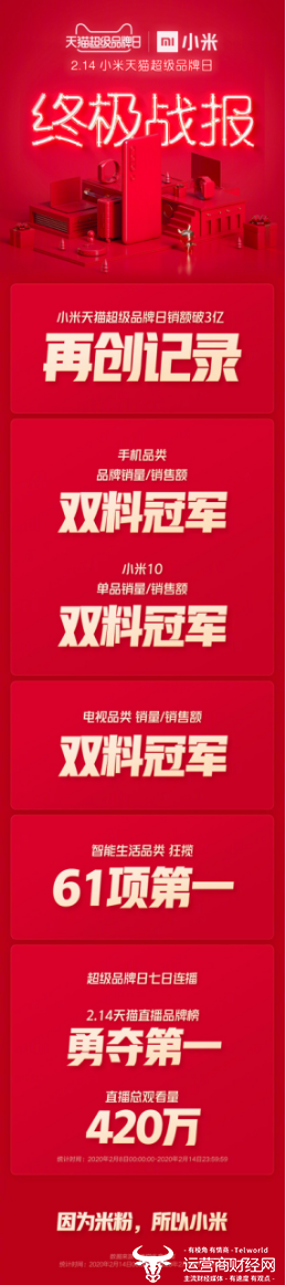 佳绩的取得,离不开小米“始终坚持做价格厚道,感动人心的好产品”作为自身的核心战略。可以说,2月 14 日小米天猫超级品牌日的骄人战绩,再次印证了其十年品牌积累下的硬实力,并在2020年开年夺得了开门红。