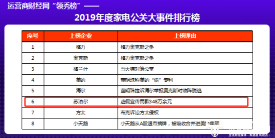 近日,运营商财经网发布了“2019年度家电公关大事件排行榜”,盘点过去一年家电企业发生的重大事件。其中苏泊尔因虚假宣传罚款348万元登上此榜。