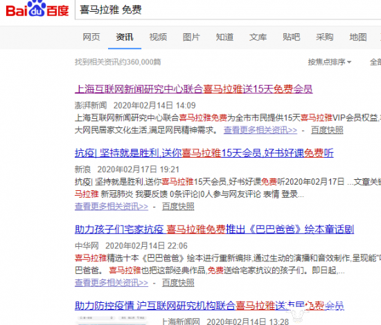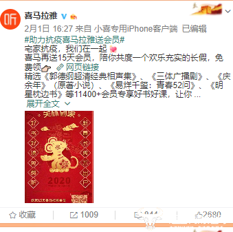 根据媒体报道,喜马拉雅FM要办件好事,即为助力宅家抗疫,喜马拉雅会员全部免费。具体是,“春节期间,喜马拉雅App会员与喜马拉雅儿童版App会员全部免费!”、“此次免费领取喜马拉雅App会员的用户,即可0元畅听超11400张会员专享好书好课专辑”。