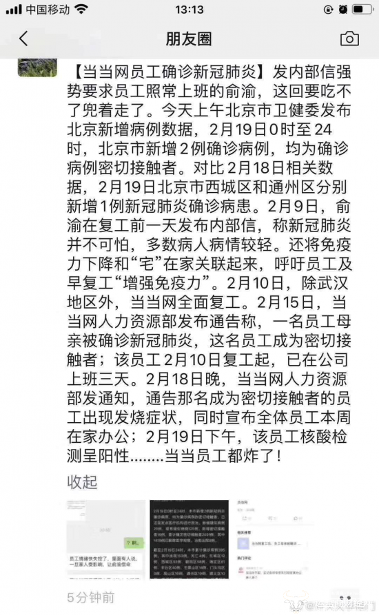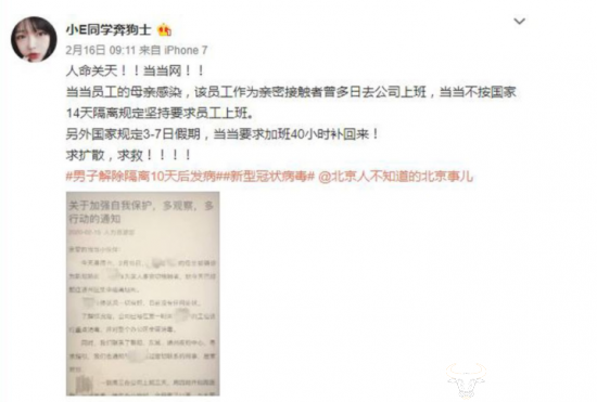 据当当市场部声明,2月15日(周六),前述员工的母亲在北京通州被确诊为肺炎。 这名员工那个星期在办公室有三天半的时间,不过,她自己和当当其他人,当时并不知道她母亲生病。